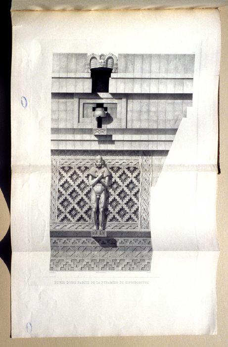 Pl. 11. "Study of a part of the Pyramid of Kingsborough" (Pyramid of the Magician, Temple V; area of the front facade directly left of the doorway, including the imagined form of a standing male sculpture).   1838