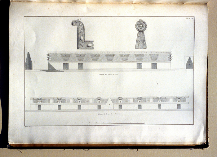 Plates 14 and 15: "Elevation of Temple of the Sun", "Elevation of Temple of Asterismes" (Elevation of Courtyard Facade of East and South Buildings).   1838