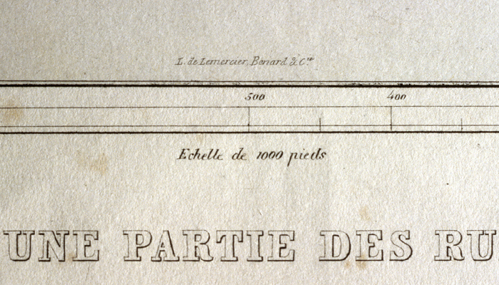 Detail of map and plan above, with name of publisher and scale of feet.   1838