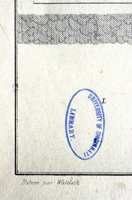 Detail of map and plan above-right, "Restored by Waldeck".   1838