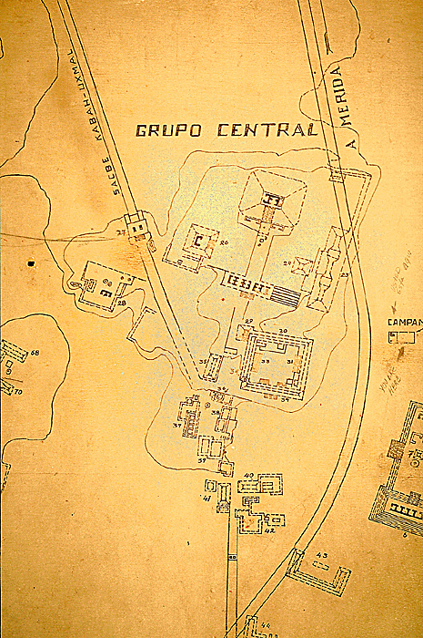 Detail of 1968 INAH map; north at top, arch and sacbé at upper left. Jan. 2002