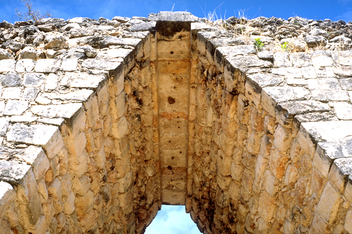 Inside of arch-like form, reconstructed (north side). The wide capstones lying on top of the two sides, which are not pressing against each other, make it clear that this arch shape is not a structural arch.       Jan. 2001