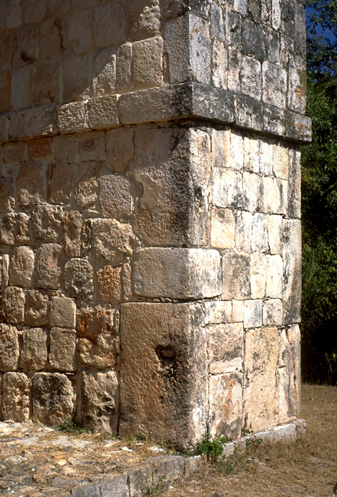 Southwest corner of east side, showing large corner stones and plain rectangular medial molding, which encircles entire pier.       Jan. 2001