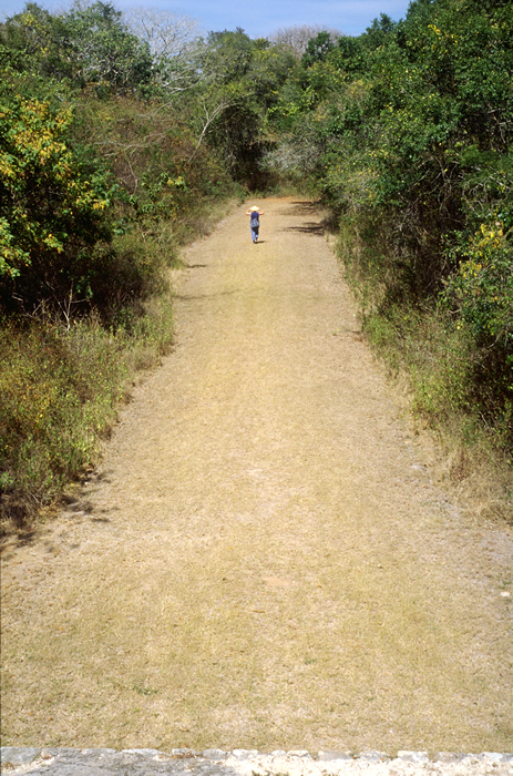 Looking north from arch along sacbé, which runs 18 kilometers (11 miles) toward Uxmal.       Jan. 2001