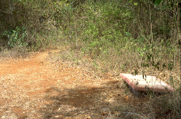 Official INAH plaque for House of the Blue Hand, beside sacbé, just north of Arch.       Jan. 2001