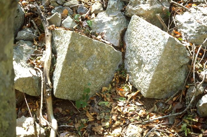 Smoothly pecked facing stones in photo at left, showing that this is a collapsed or unfinished building.       Jan. 2001