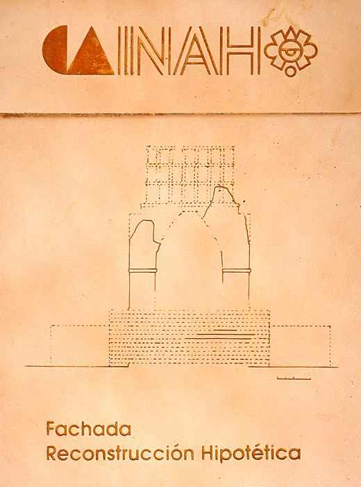 Detail of plaque at left; elevation diagram, dotted lines indicate reconstructed portion and hypothetical design of roofcomb.