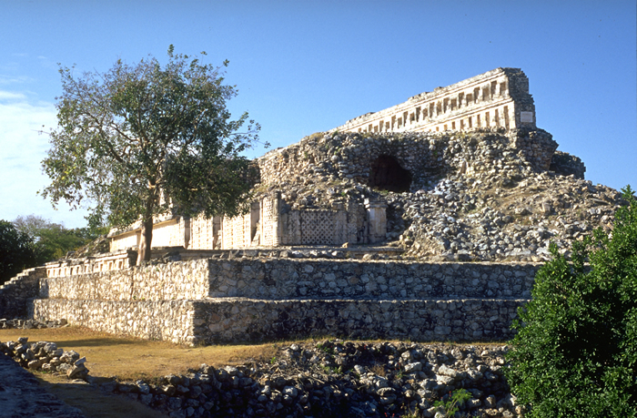 Northeast corner of Codz Poop, showing partly restored lower facade and stepped walls of terrace.       Jan. 2001