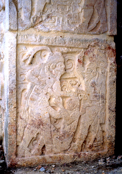 Lower half of doorjamb in photo at far left, relief representing domination, perhaps slaying, of nude, submissive captive.       Jan. 2001