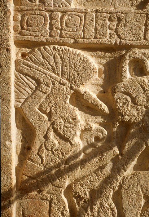 Detail of lower relief in photo above, figure at left, with elaborate headdress, throwing spear with atlatl.       Jan. 2002