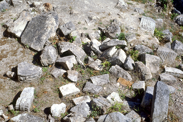 Details of fallen facade pieces in photo at left.       Jan. 2001