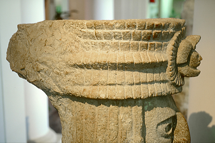 Six photos of a head from one of monumental warrior figures, originally on upper facade of back of Codz Poop, a so-called "King of Kabah", now in the Museo de Antropología e Historia de Yucatán, Mérida.       Jan. 2003