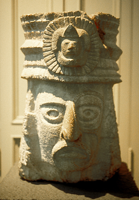 Frontal view, showing that scarification is only on his proper left side, eyes presumably held shell or obsidian inlays.       Jan. 2002