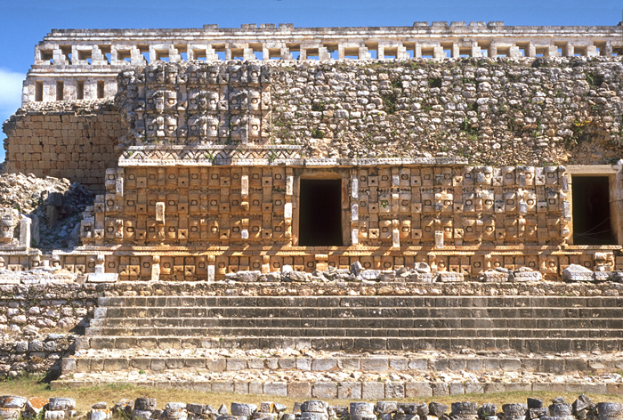 Panorama, left-to-right no.2: showing the only intact section of upper and lower tiers (crucial evidence); remainder of facade partially restored.       Jan. 2001
