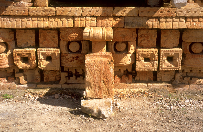 Bisymmetrical, mosaic mask below 2nd of 5 original doorways; snout in center, eyes next to snout, next are ear ornaments. In each pair of ornaments, 1 belongs to the central mask, the other to the adjoining mask, outside this photo.       Jan. 2002