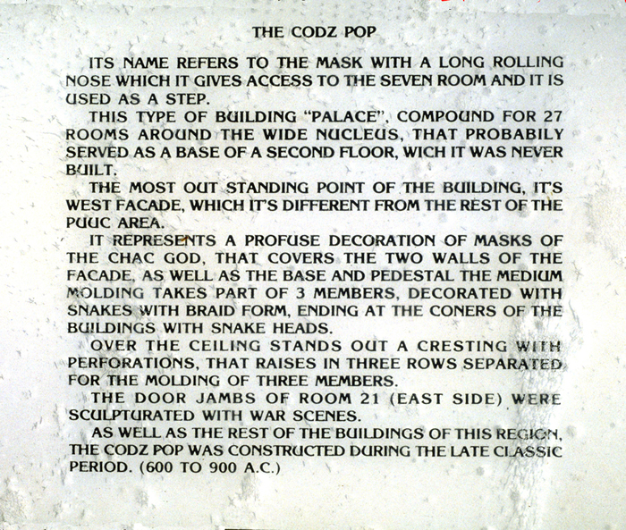 Detail of INAH sign in photo at left; description in English.