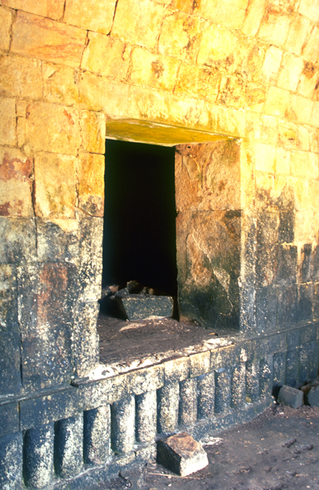 Raised doorway to back room; 3 part molding with colonnette along base.       Jan. 2002
