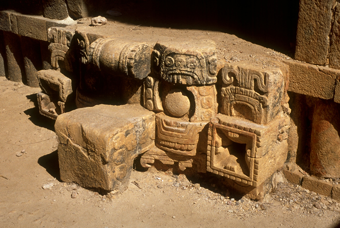 Same deeply three dimensional mask, with fully protruding roll-like eyebrow level spool; bottom of snout step broken off.       Jan. 2001