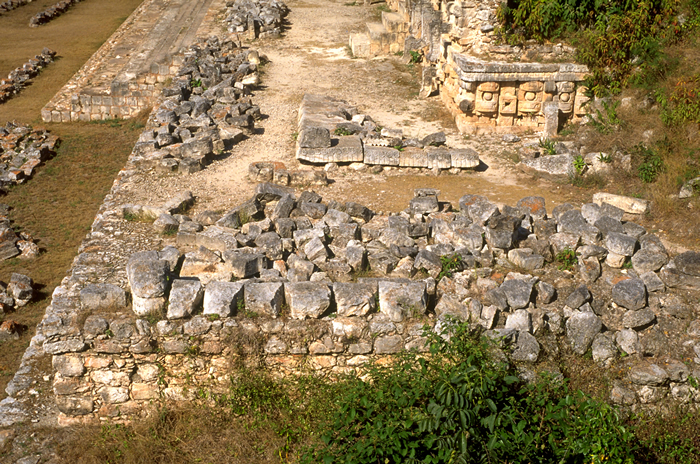 Southwest corner of terrace surrouding Codz Poop, showing many collapsed facade stones.       Jan. 2001