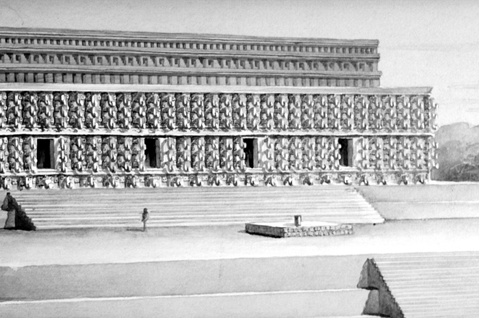 Watercolor reconstruction drawing by Tatiana Proskouriakoff, 1946; scanned from 35mm slide of the original watercolor drawing. Reproduced Courtesy of the Peabody Museum of Archaeology and Ethnology, Harvard University.