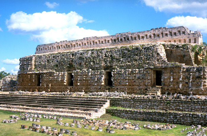 No other known Puuc building originally had continuous masks covering both upper and lower facade levels. The only surviving section with both upper and lower facade masks can be seen in this photo and in 1899-1891 photo above-center.       Nov. 1999