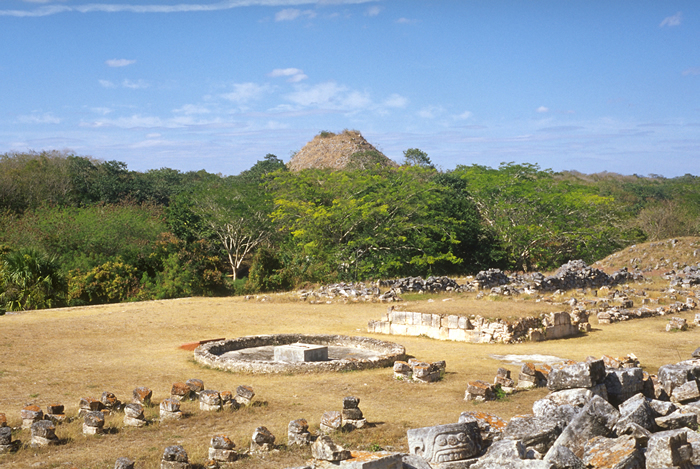 Terrace with chultune near center; the squarish altar toward right. Great Pyramid in the distance.       Jan. 2001