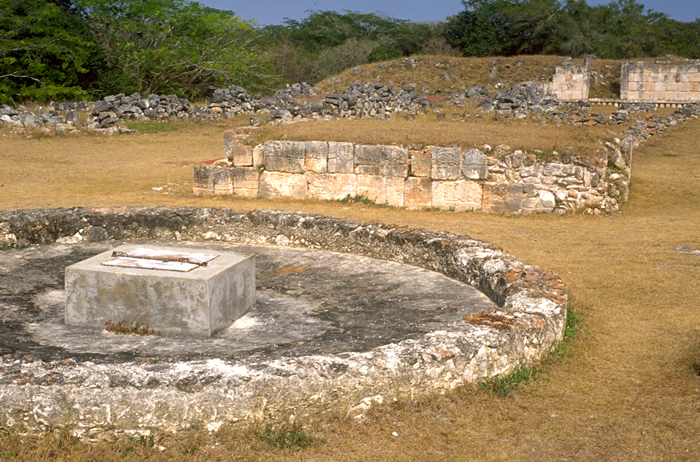 Chultune with modern cap and, beyond, squarish altar.   Jan. 2001