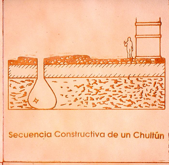 Detail of INAH plaque at left; showing a vertical cross-section of chultune near building, with catch basin at top, mouth and neck, and storage basin at bottom.       Jan. 2001