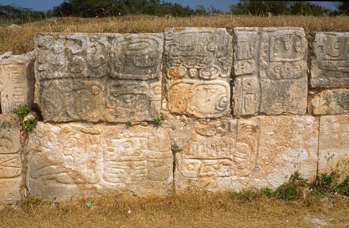 Glyph stones of south side of altar (left to right sequence no.2); female head glyph at far left in upper row.       Jan. 2001
