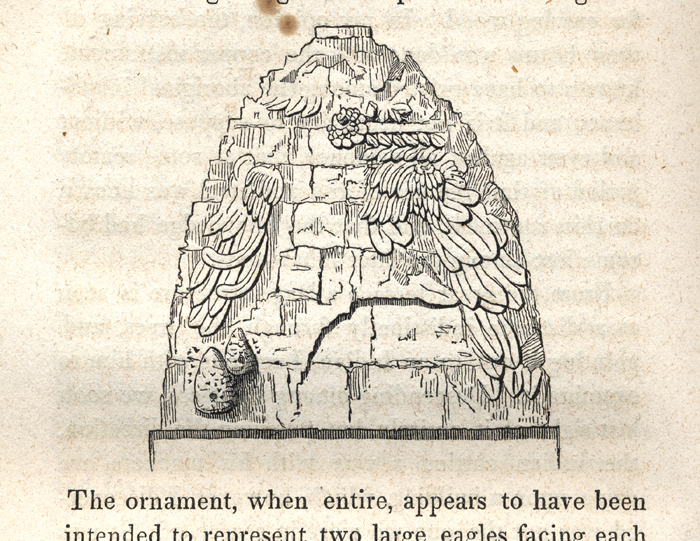 Kabah, structure near Building of the Red Hands; stucco ornament on end wall of interior room, "painted, the colours being still bright and vivid".         Scanned from Stephens and Catherwood, Incidents of Travel in Yucatan, 1843 (Vol. I, p. 410); closely based on Frederick Catherwood’s 1841-42 on-site drawing.