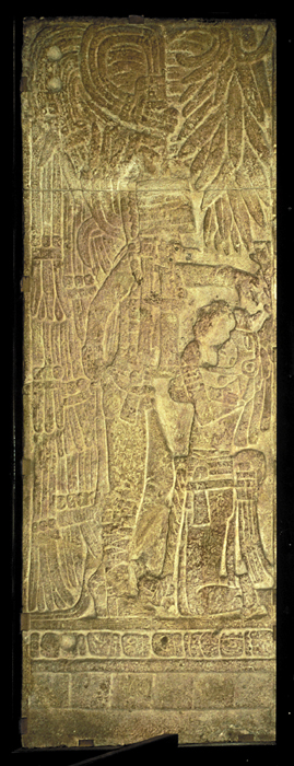 This photo and photo below show 2 carved stone doorjambs from an "unpretentious building" near the Building of the Red Hands, Kabah. Both doorjambs were removed by Stephens and Catherwood in 1841 and are now in the American Museum of Natural History, New York City.              April 2002 (flash)