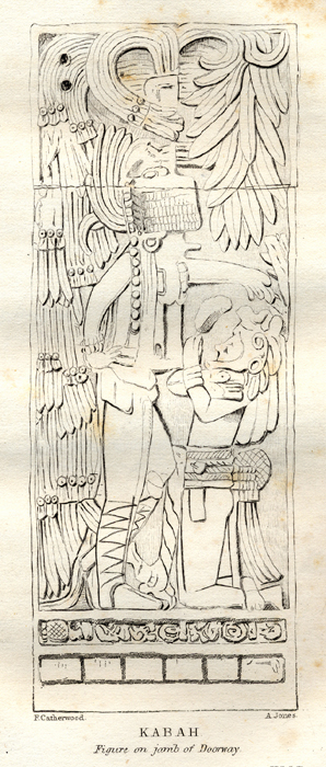 "Kabah, Figure on jamb of Doorway. / F. Catherwood., A Jones"; from an "unpretentious building" near Building of the Red Hands.                           Scanned from Stephens and Catherwood, Incidents of Travel in Yucatan, 1843 (Vol. I, facing p. 412); closely based on Frederick Catherwood’s 1841-42 on-site drawing.