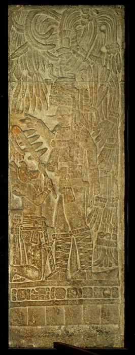 In each of these 2 doorjambs, a king, with magnificently elaborate, plumed headdress, stands above a kneeling, conquered chief. What may appear to be long, pointed noses on the standing figures are instead nose plugs.              April 2002 (flash)