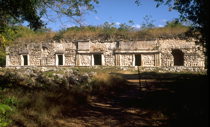 Front (west) facade with five doorways; cleared and restored 1953.  Jan. 2001