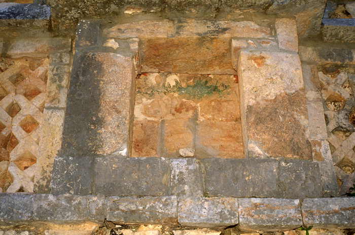 Room-like recession in thatched building at right of vaulted archway; showing stone tenon which presumably supported a seated figure; showing stucco remains of a feather-like headress, with blue-green paint remains, and other red paint remains.       Jan. 2001 (flash)