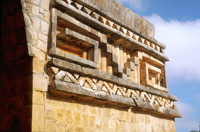 Angled view of frieze at right side of archway, showing three-dimensional character.       Jan. 2002