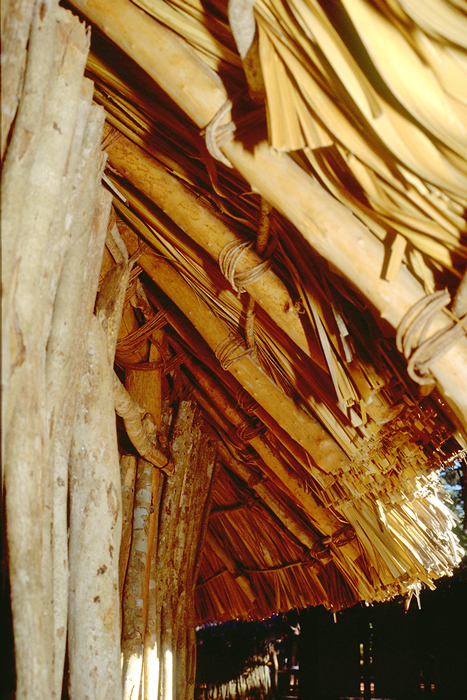 Same domestic hut showing roof overhang, with ends of palm thatch evenly trimmed, slightly higher at doorway.    Jan. 2001 (flash)