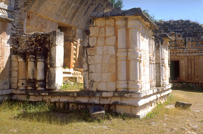 Room projecting in front of west structure, its front facade at right reconstructed 1991-1992, small sculpted heads in base.       Jan. 2001
