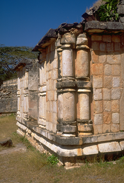 Front-right corner with well rounded corner columns with spools top, middle and bottom; Labná Palace is unusual in having 3 columns at several corners.  Jan. 2001