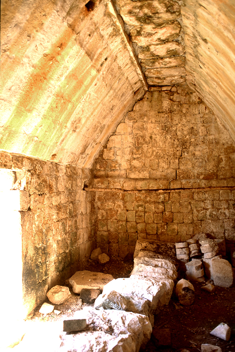 Back room, doorway to collapsed front room at left; showing that transverse wall is not bonded with longitudinal wall.