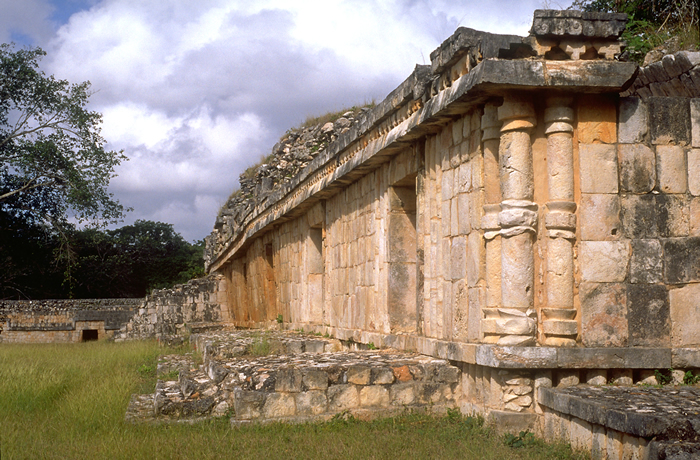 Southeast corner of east structure, showing contrast between sagging original medial molding and straight reconstructed medial molding.
