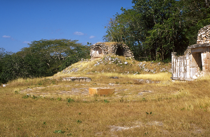 Upper Level: looking past chultune to largely collapsed structure on west side of Palace, showing front and back vaults.      Jan. 2001