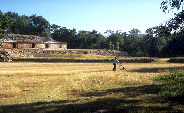 Sacbé running across large, open plaza, modern passage cut through sacbé.       Jan. 2001