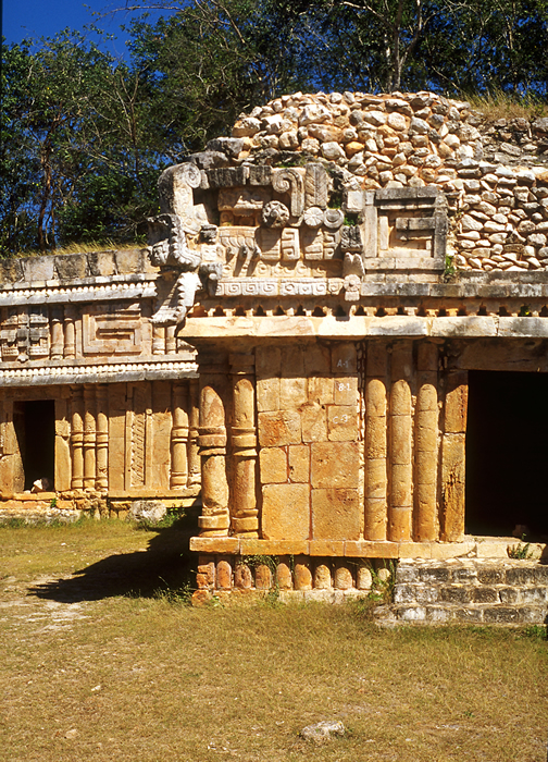 Southwest corner of east structure with, in frieze, famous sculpture of open serpent jaws with human head protruding.       Jan. 2001