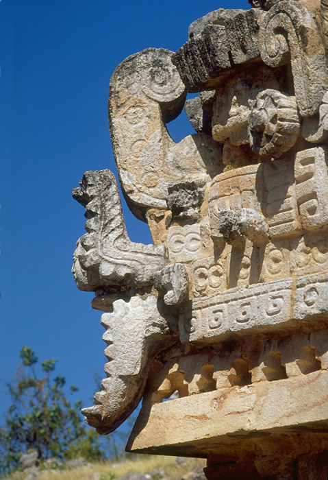 Profile of same corner sculpture as in photos above; open serpent jaws with human head protruding.      Jan. 2001