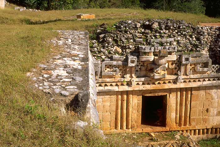 Same west facade of east structure, seen from upper level of central area, chultune on upper level beyond.       Jan. 2002