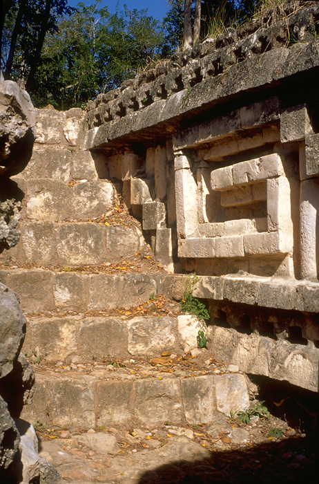 Upper flight of staircase, fret motif at right.        Jan. 2002