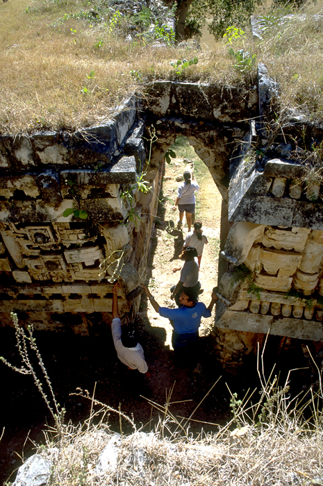 Looking down to lower flight of stairs, showing archway joining east and west structures, corner masks on both sides.    Jan. 2003 (24 mm lens)