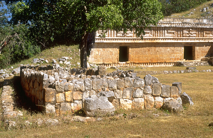 Remains of small collapsed structure on terrace; just visible at far left of photo at far left.       Jan. 2001