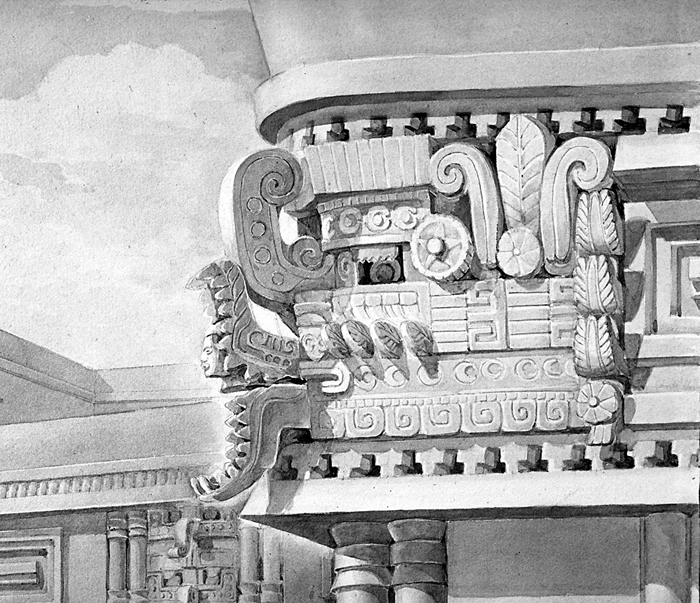Watercolor reconstruction drawing by Tatiana Proskouriakoff, 1946; scanned from 35mm slide of the original watercolor drawing. Reproduced Courtesy of the Peabody Museum of Archaeology and Ethnology, Harvard University.
